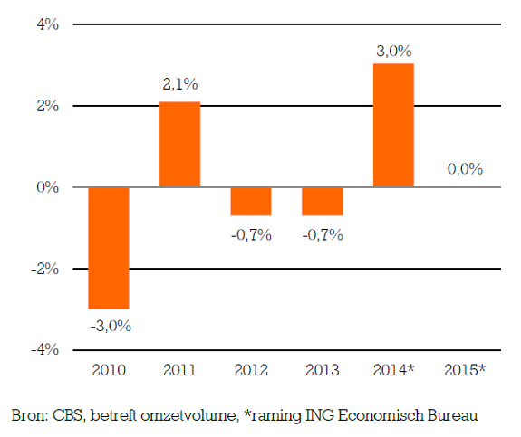 De ING is niet positief over de ontwikkeling van de omzet in de horeca in 2015. De omzet in de horeca zal zich in 2015 naar verwachting stabiliseren. De sterke groei van de verkopen in 2014 (+3%) krijgt volgens de bank nog geen vervolg. Ondanks het uitblijven van groei in 2015 worden ten opzichte van het dieptepunt in 2010 duidelijk meer overnachtingen geboekt in hotels en maaltijden en drankjes verkocht in restaurants en cafetaria’s. Cafés zijn het kind van de rekening van veranderend consumentengedrag. Na een korte opleving in 2014 vanwege het warme weer en het WK voetbal komen de verkopen in 2015 wederom onder druk te staan.