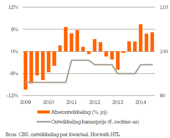 Vooral in de hotellerie is de grotere toestroom van buitenlandse gasten een belangrijke pijler onder de omzetontwikkeling. Na een sterke groei in 2014 volgt naar verwachting een lichte toename van het omzetvolume in de hotellerie in 2015. De populariteit van Nederland bij buitenlandse toeristen is verder gestegen en ook het aantal Nederlandse gasten dat overnacht stijgt nog licht. Bij een toenemend kameraanbod is de gemiddelde kamerprijs de afgelopen jaren redelijk stabiel gebleven. In 2015 wordt een lichte stijging verwacht.. De prijzen, bezetting en opbrengst per kamer zijn in de regio Amsterdam beduidend hoger dan in de rest van Nederland. Het aanbod groeide in 2014 met meer dan 3%, op dit moment telt Nederland ruim 117.000 hotelkamers. Daarbij daalde het aantal kamers met 1 of 2 sterren.