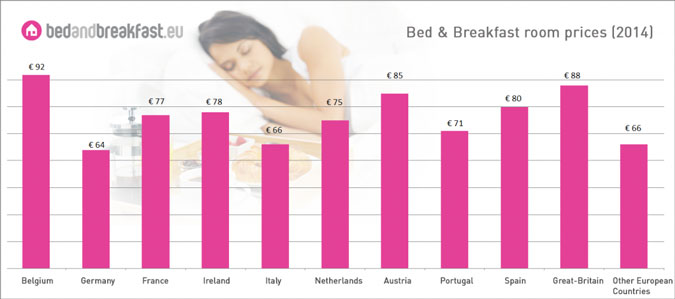 Uit onderzoek dat Bedandbreakfast.eu in 2014 hield onder 3.704 b&b-eigenaren blijkt dat in Europa gemiddeld voor een overnachting € 76,46 wordt betaald. Goedkoopst is een b&b in Duitsland (€ 64,-), het duurst in België (€ 92,-). In Nederland moet gemiddeld € 75,- voor een kamer worden betaald. Andere conclusies: